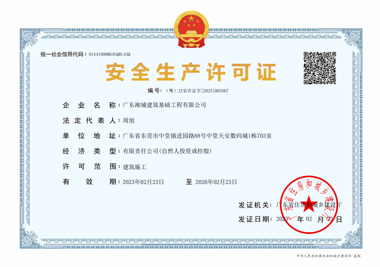 廣東湘城建筑基礎工程有限公司,成立于2016年,注冊資金4888萬元,持有地基基礎工程專業(yè)承包壹級資質(zhì),具有安全生產(chǎn)許可證??沙薪痈鞣N基礎類施工,包括各類樁基礎、基坑支護、邊坡支護、地基強夯處理等施工業(yè)務。公司為地基與基礎工程專業(yè)承包、工程施工、技術咨詢、技術開發(fā)、技術服務、信息咨詢實體型企業(yè)。